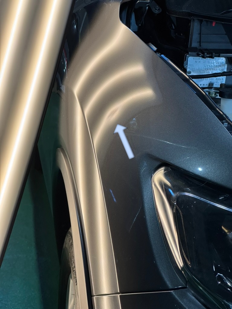 フロントフェンダーは比較的アクセス性がよく、今回はエンジンルーム側から工具を差し込んでヘコミを押し出す形で修復しています♪