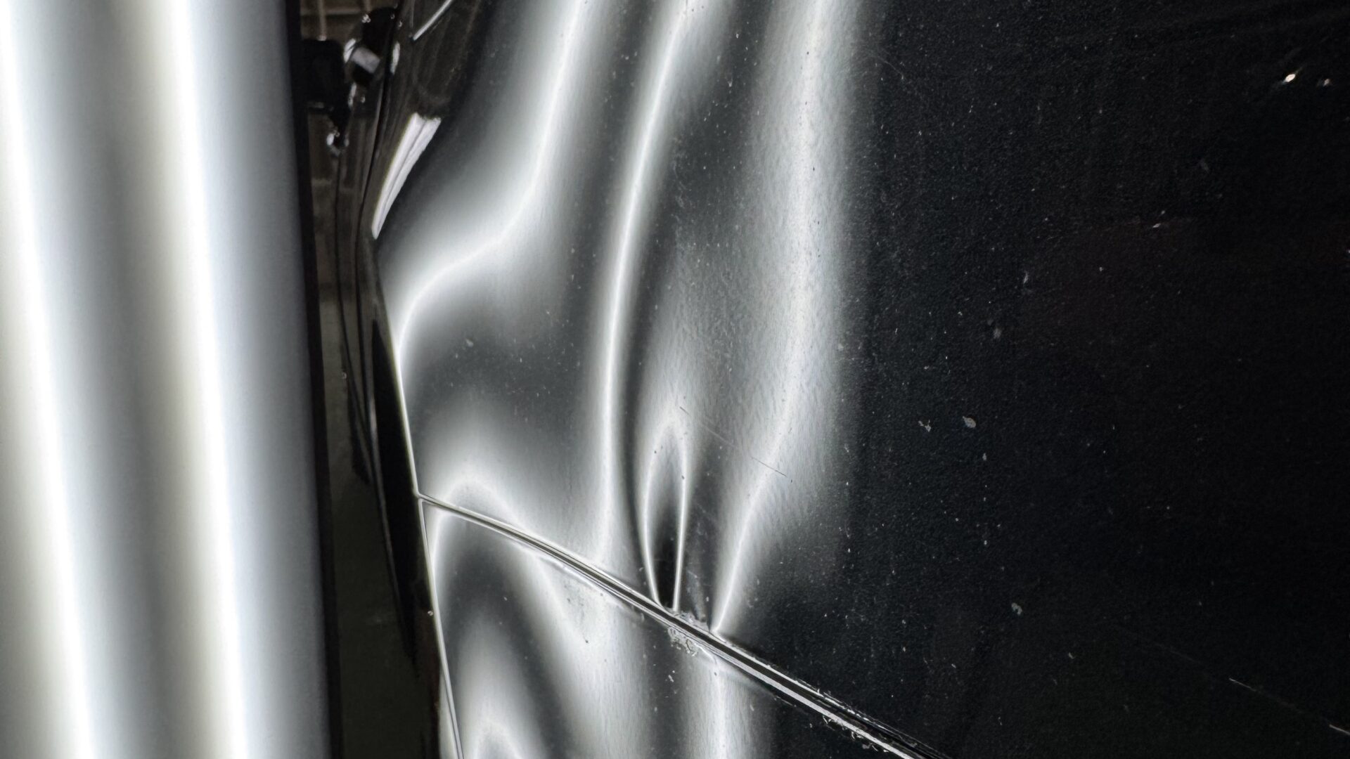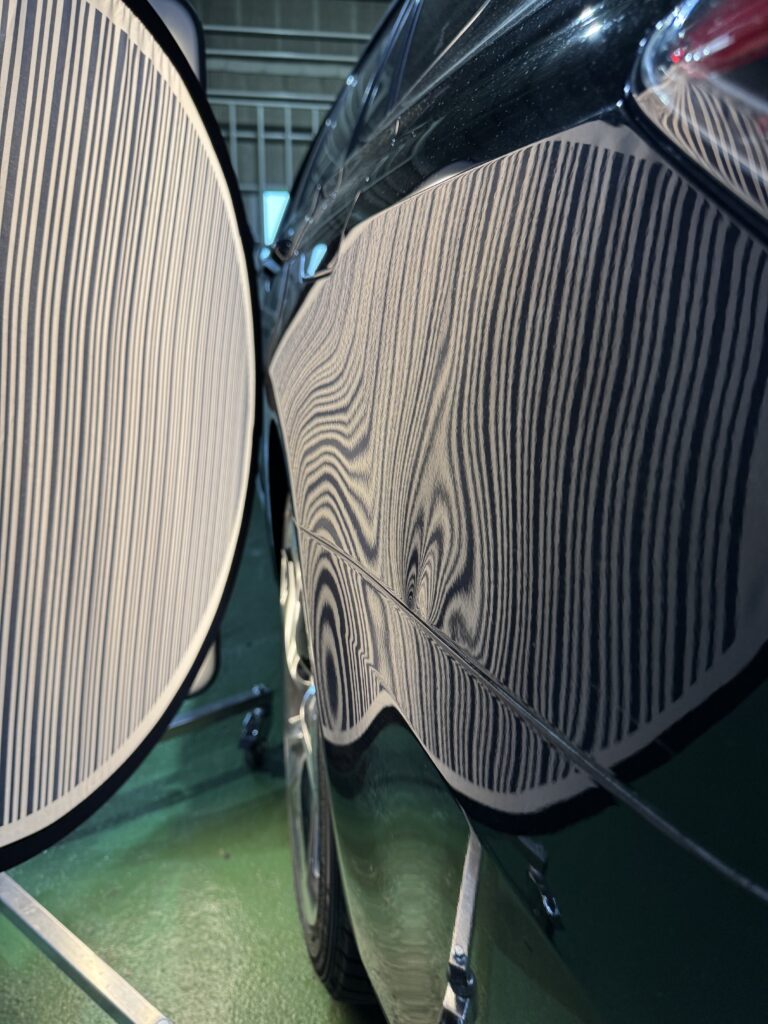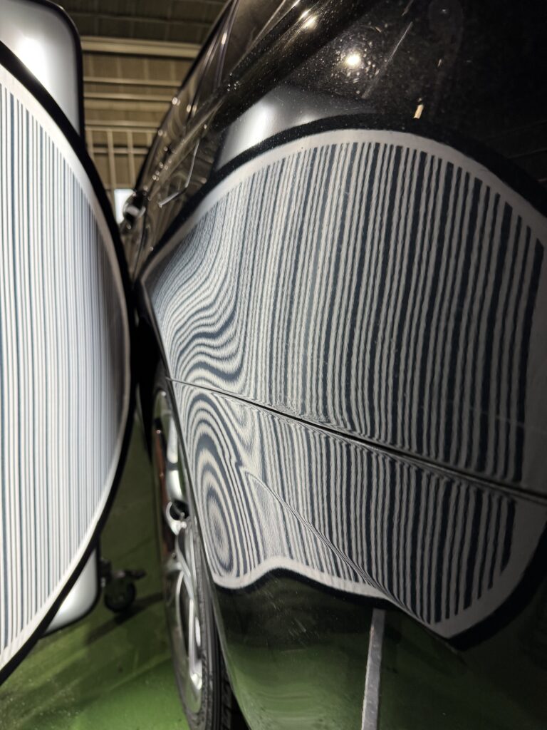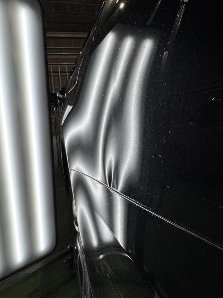 こちらのヘコミは、クォーターパネルとバンパーの境目が完全に折れており、加えて塗装割れもあるため、デントリペアでの完全修復は難しいケースとなります(-_-;